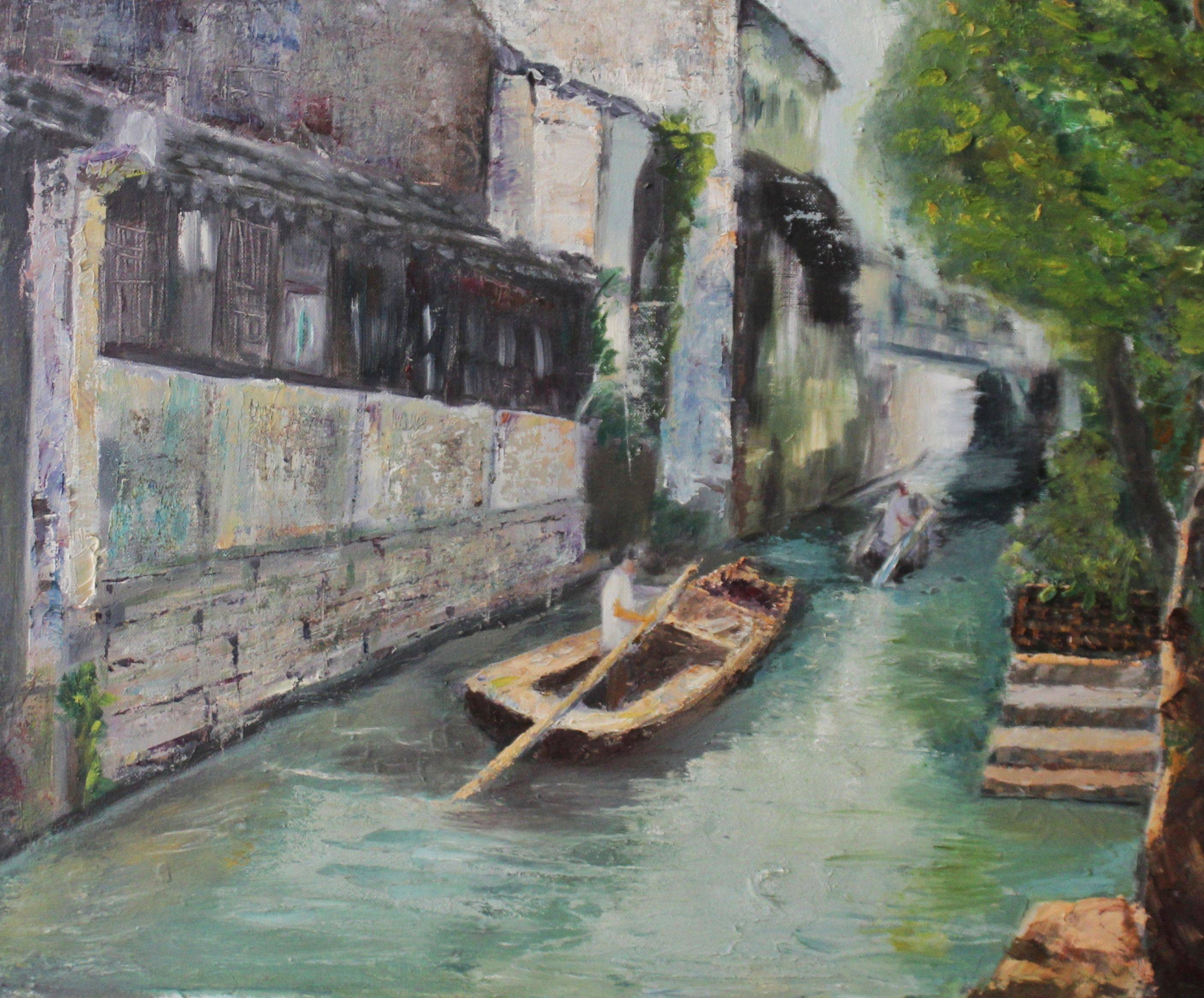 不肯走远的,还有小船上划桨的船夫。他穿着白衬衫,仿佛在思考着什么。印象里,临河的民居的墙是笔直的,墙在水里的倒影也是笔直的,而那小木船上不卑不亢的船夫,脊梁也是笔直的。