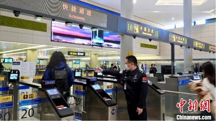 上海虹桥边检站民警引导旅客通过快捷通道。吴晓蕾 摄