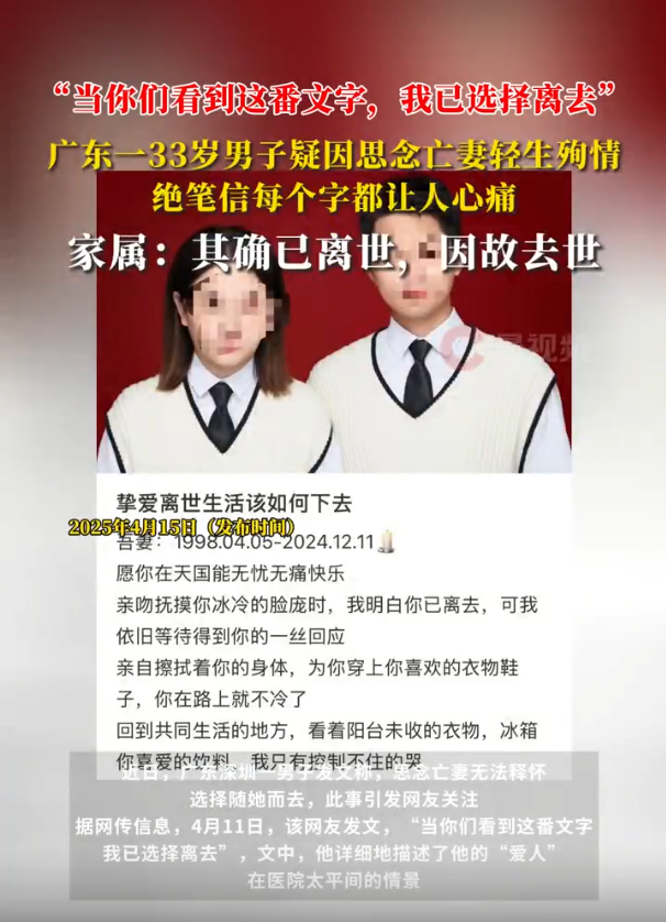 近日,广东深圳一男子发文称,思念亡妻无法释怀,选择随她而去,此事引发网友关注。据网传信息,4月11日,该网友发文,“当你们看到这番文字,我已选择离去”,文中,他详细地描述了他的“爱人”在医院太平间的情景。在文章最后,该网友写道,“我的确累了,我要好好休息了,我要结束的并不是生命而是痛苦”,“再见了,每一位。绝笔”。4月11日,记者从谢某振家属、好友及其妻子家属处获悉,其确已去世。